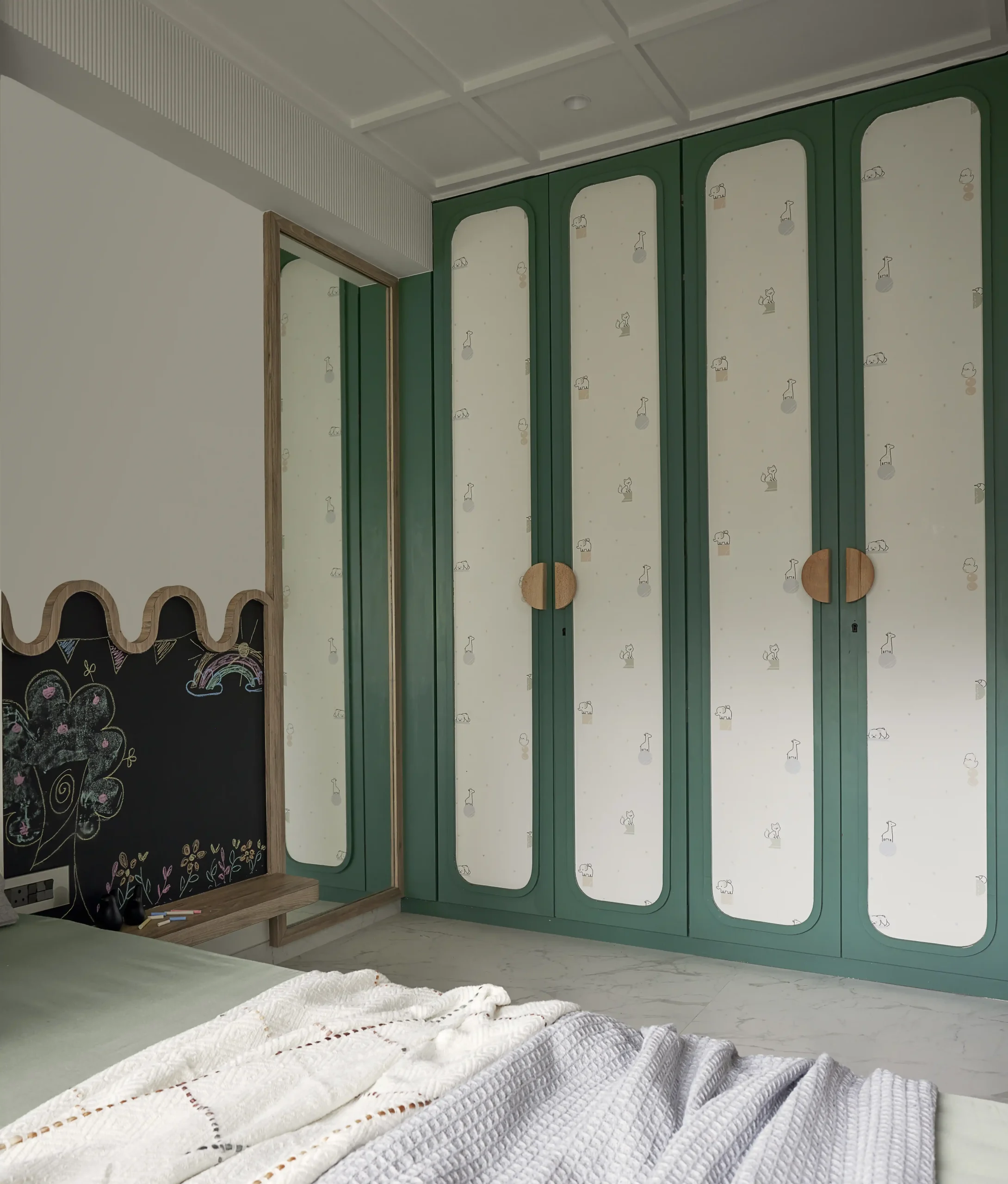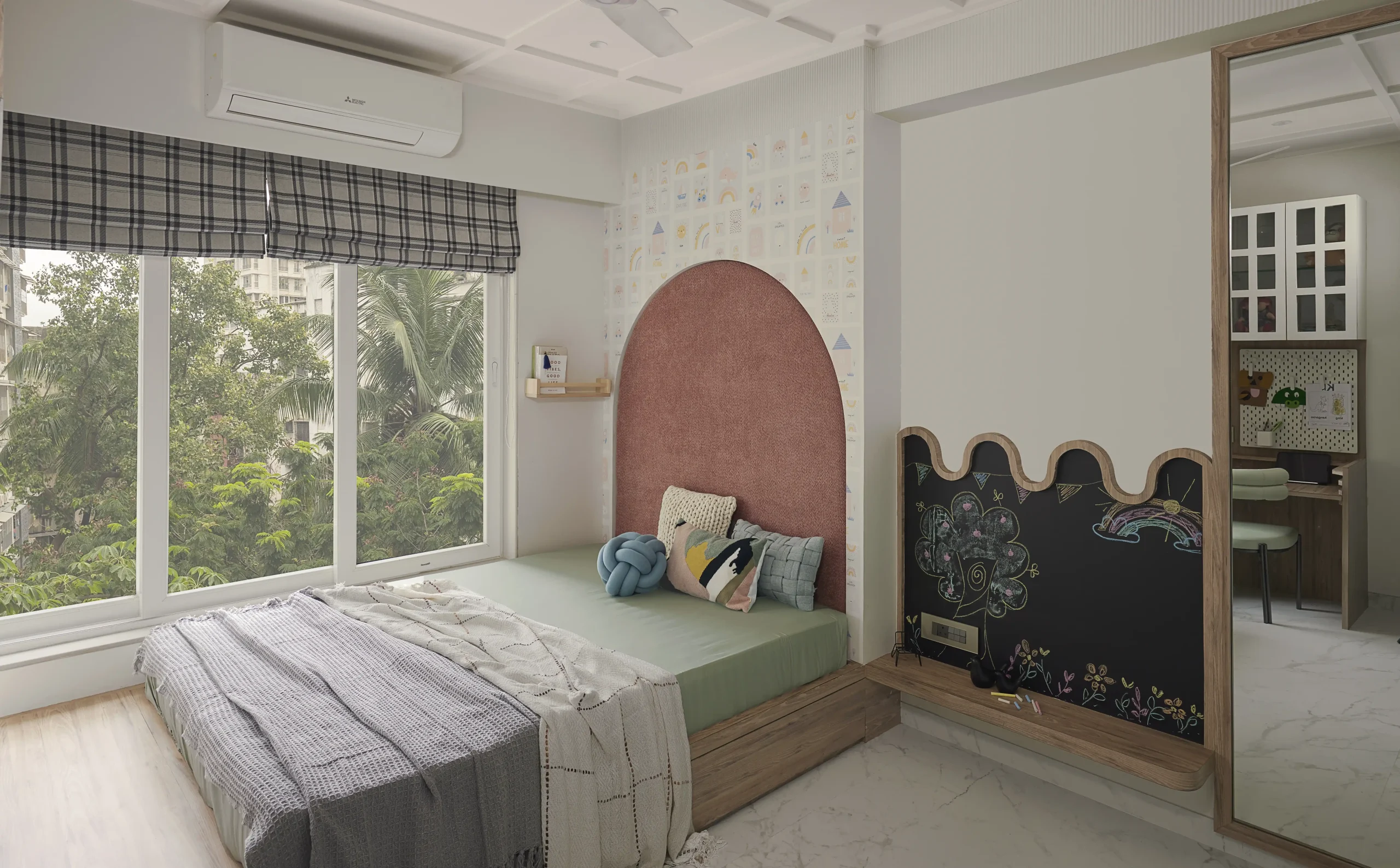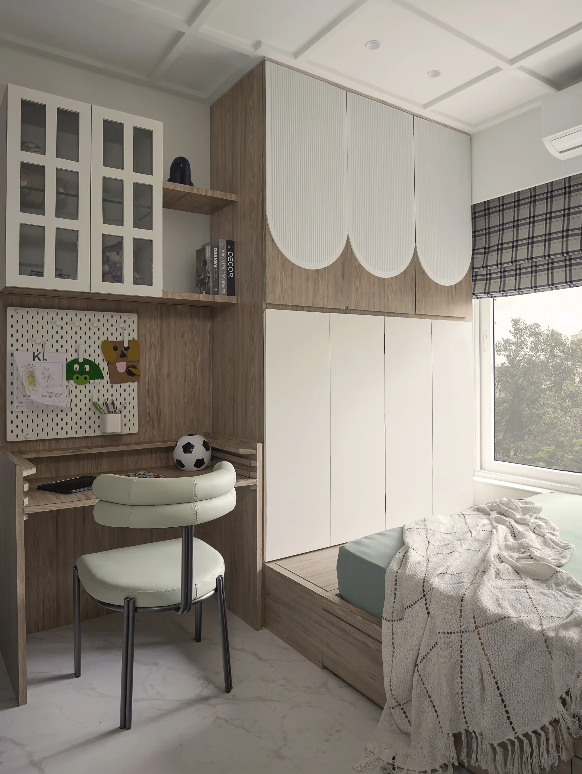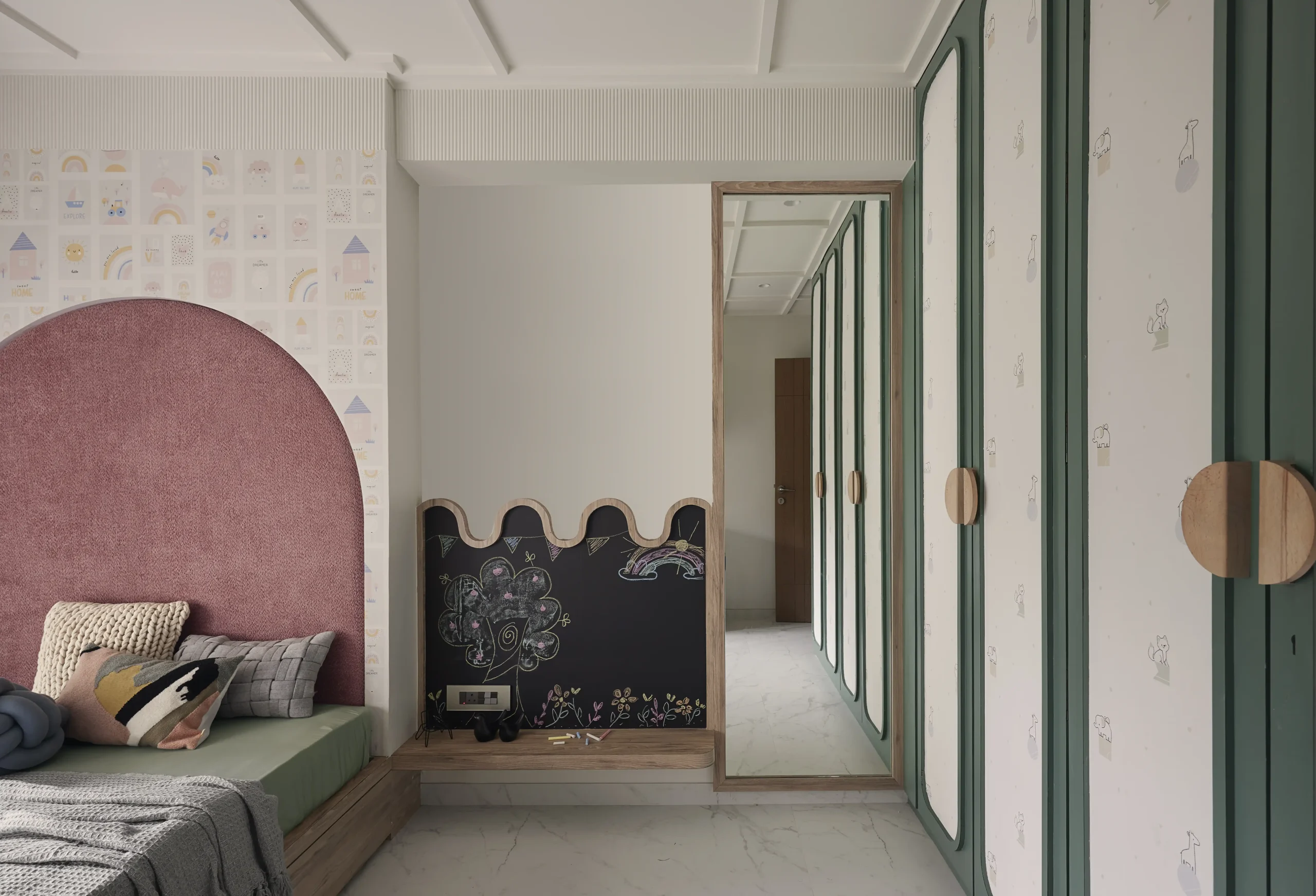 Designed with a keen eye for detail, the interiors celebrate natural textures, soft palettes, and sculptural accents creating a home that feels both refined and deeply personal. From the cozy children’s bedrooms with scalloped wardrobes, chalkboard walls, and pegboard study nooks, to the serene master suite adorned with every space is tailored for comfort and creativity.