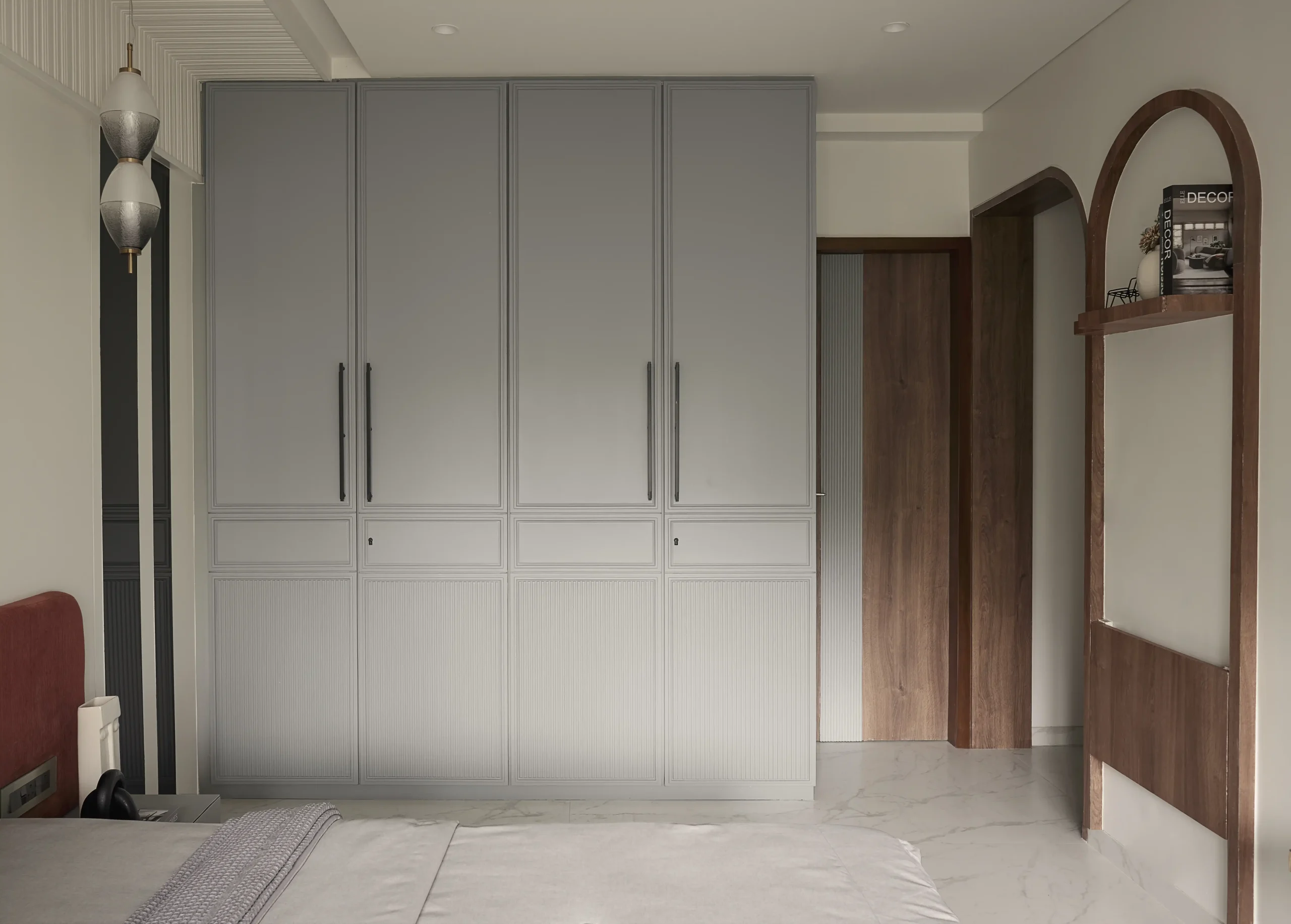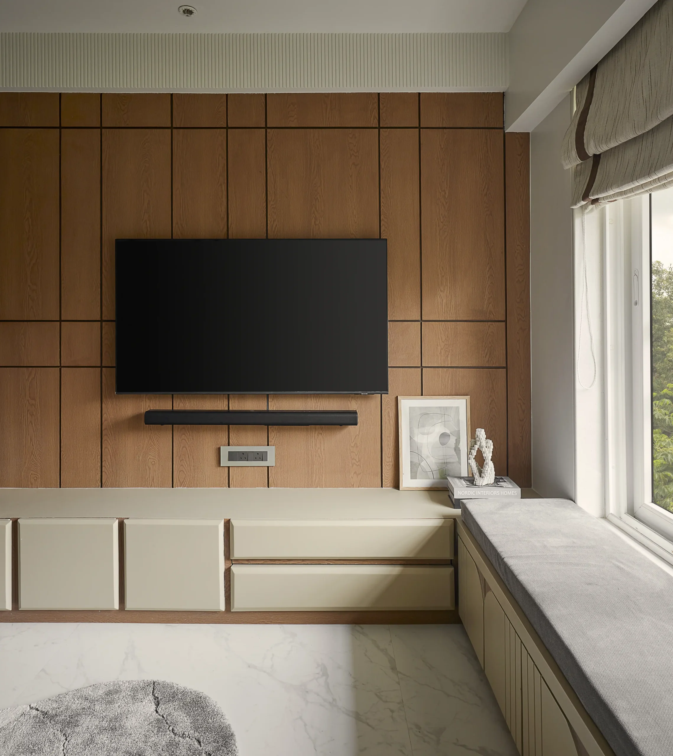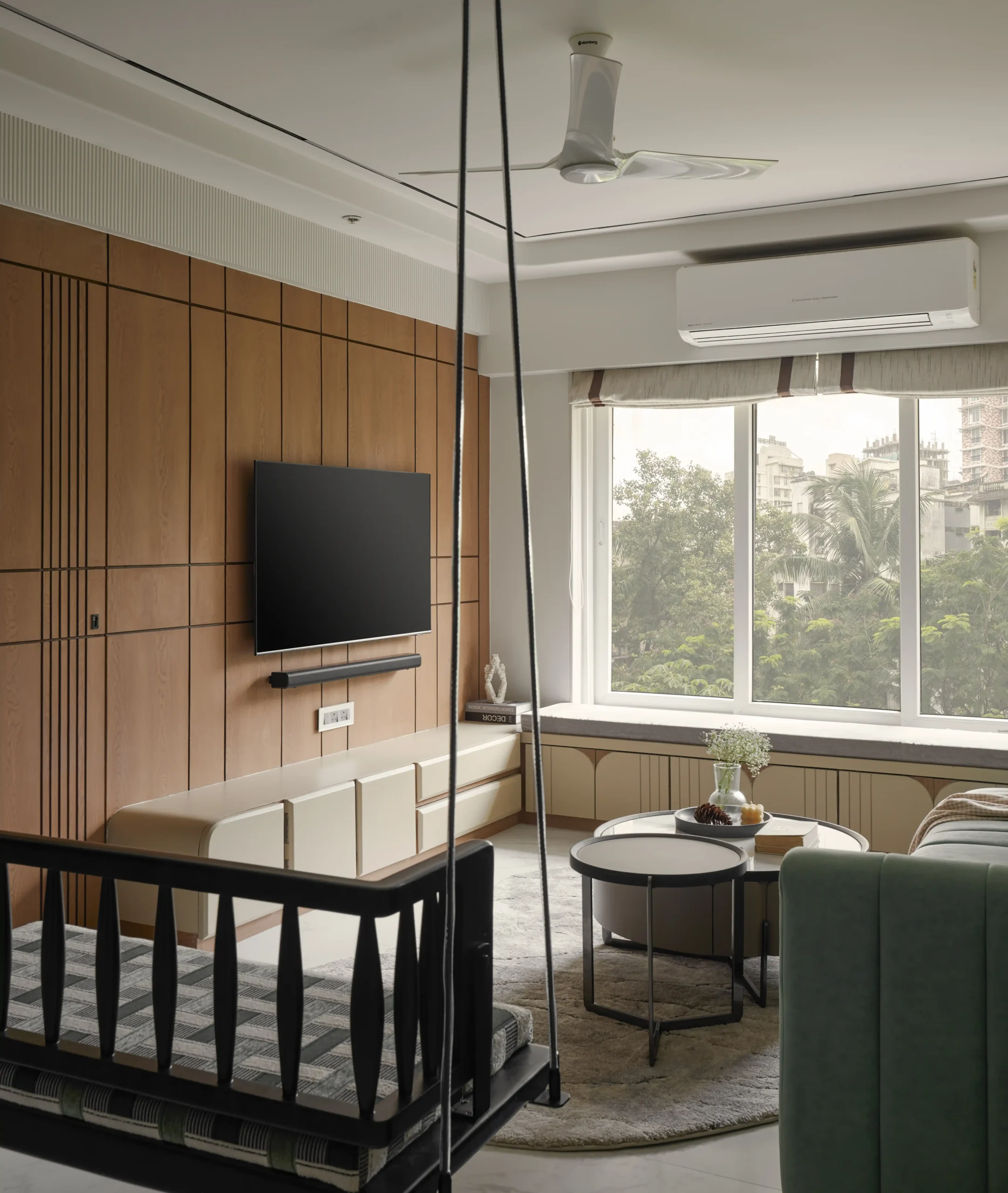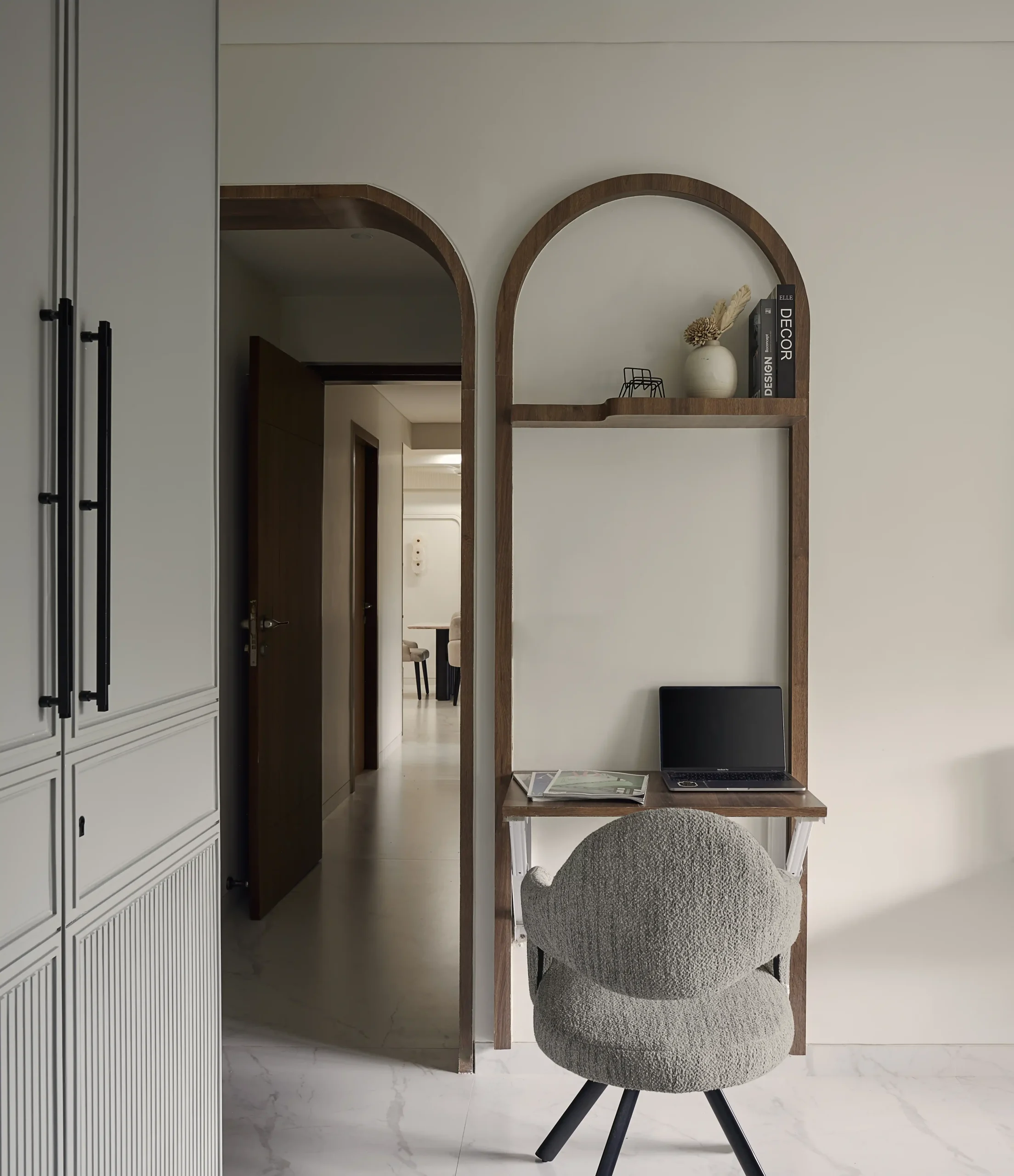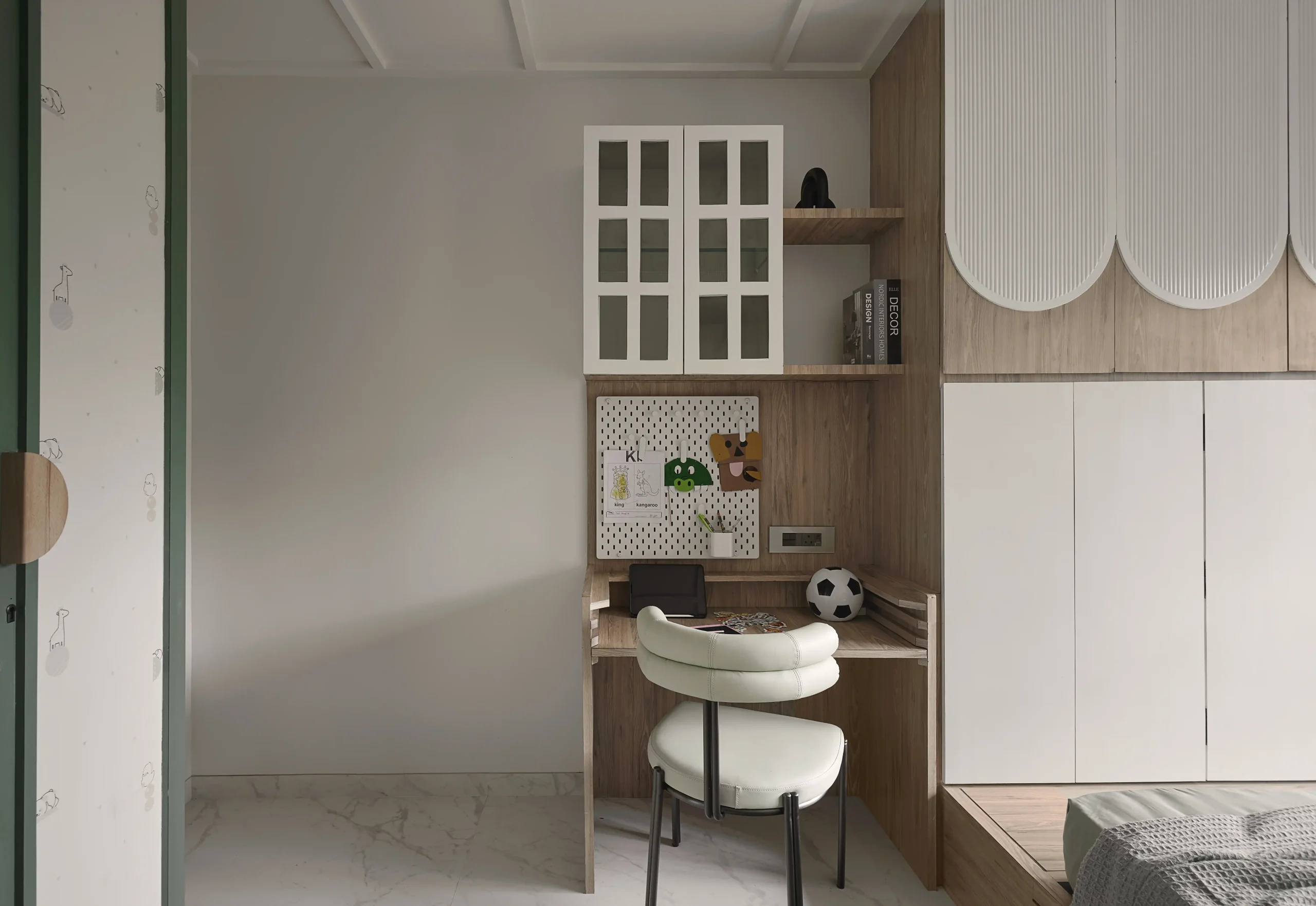 Designed with a keen eye for detail, the interiors celebrate natural textures, soft palettes, and sculptural accents creating a home that feels both refined and deeply personal. From the cozy children’s bedrooms with scalloped wardrobes, chalkboard walls, and pegboard study nooks, to the serene master suite adorned with every space is tailored for comfort and creativity.
