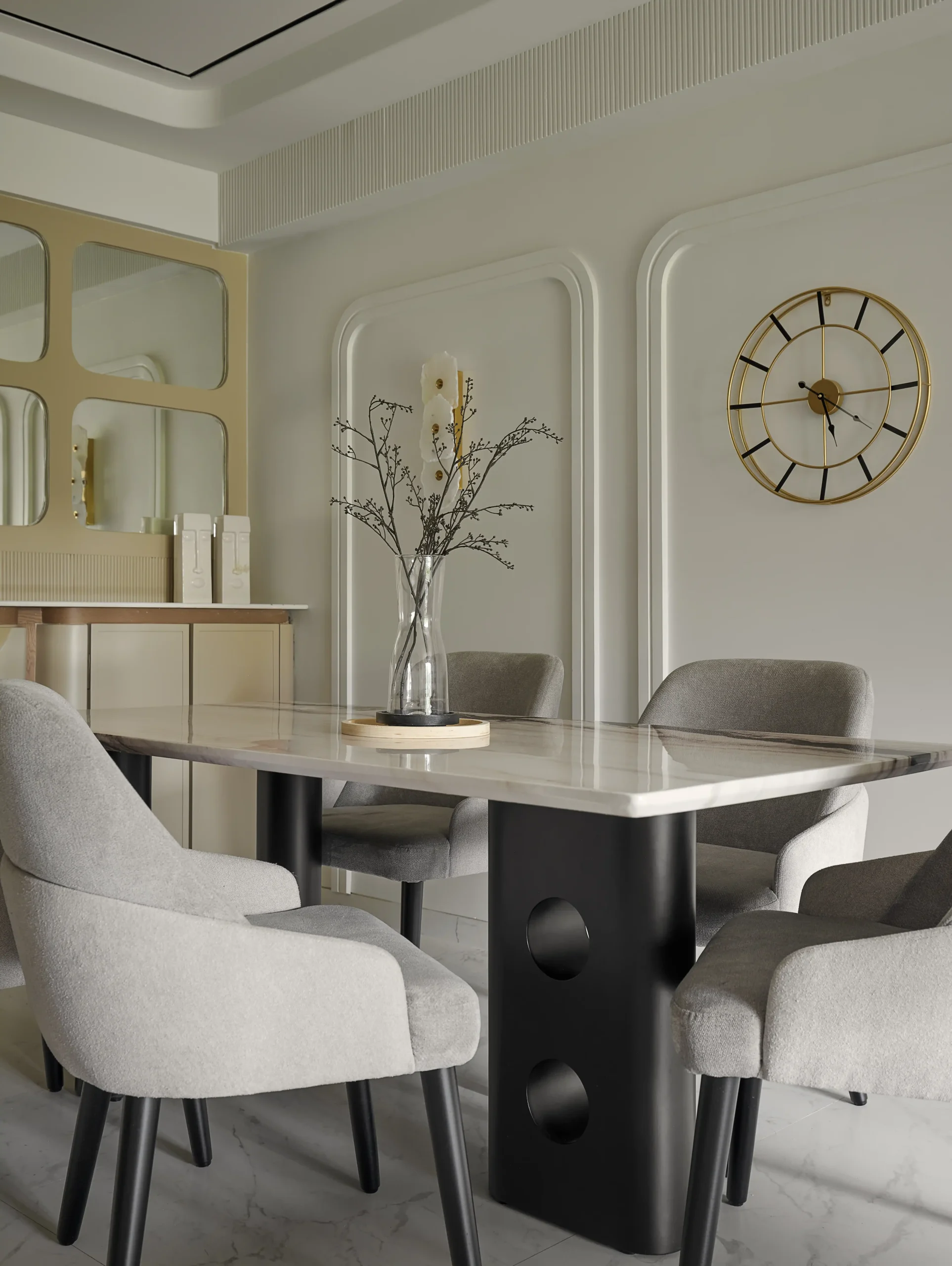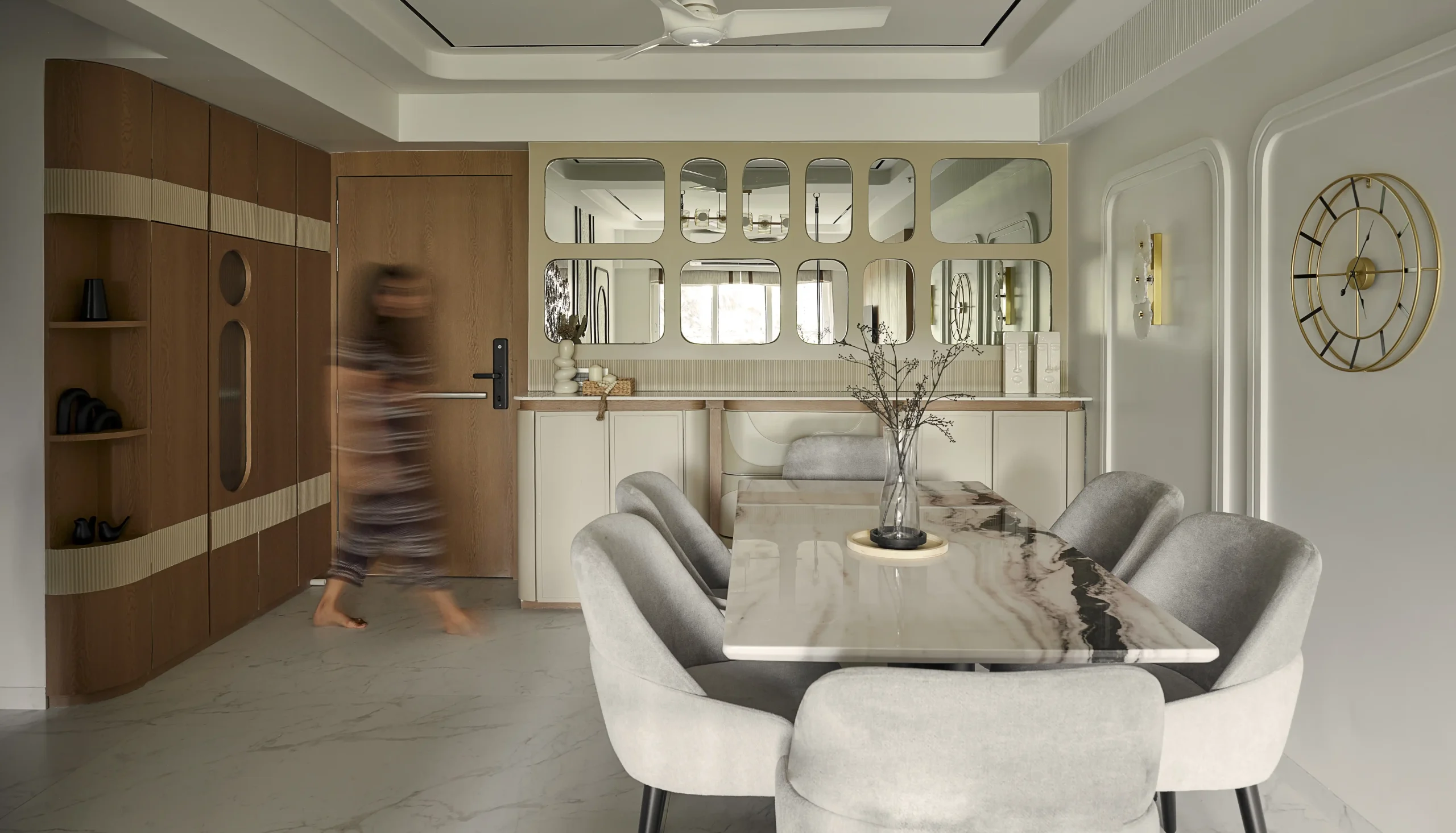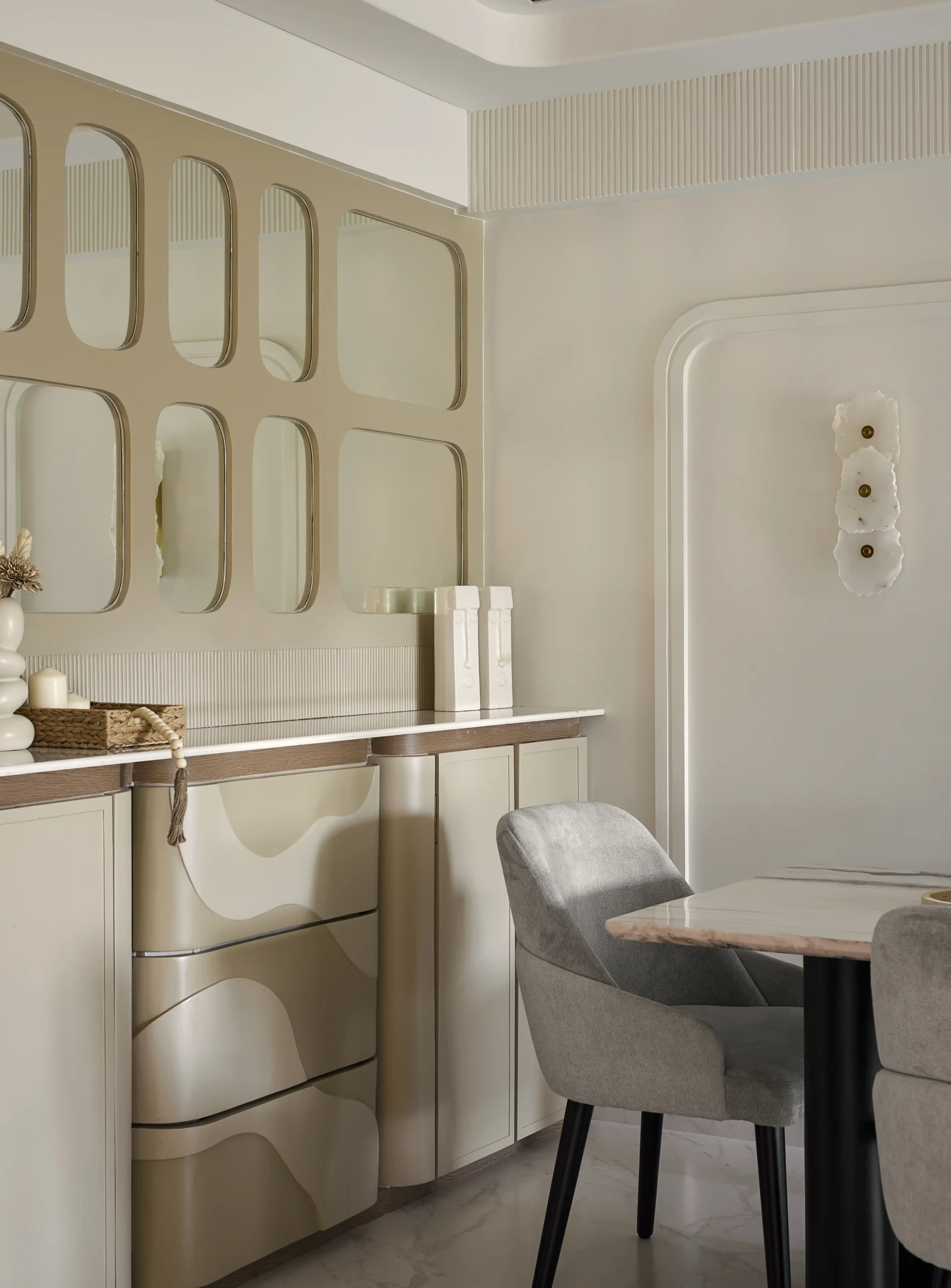 The living and dining areas featured and mirrored installations that reflect light and amplify warmth. Marble flooring, arched niches, and layered lighting add depth and sophistication throughout.