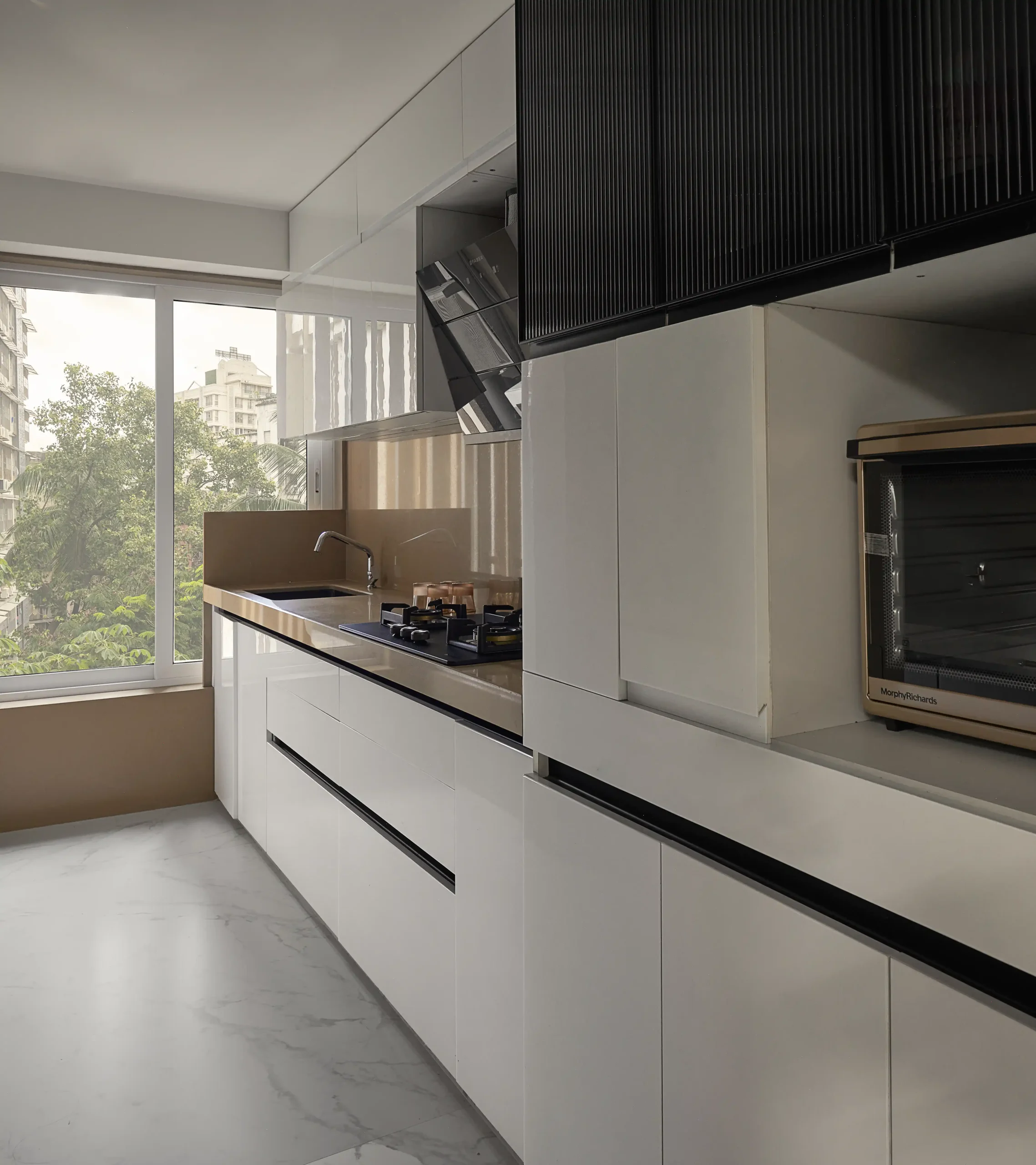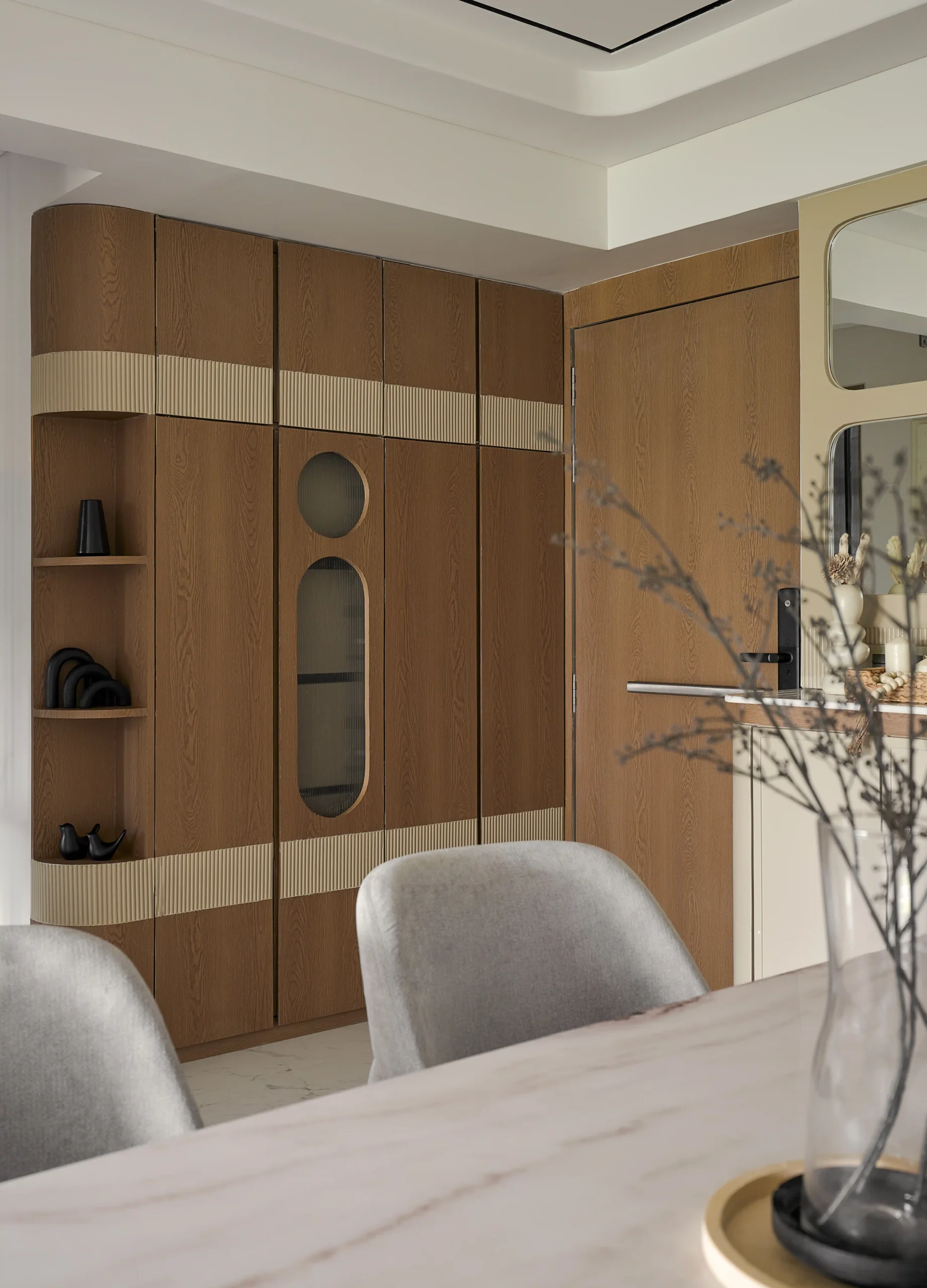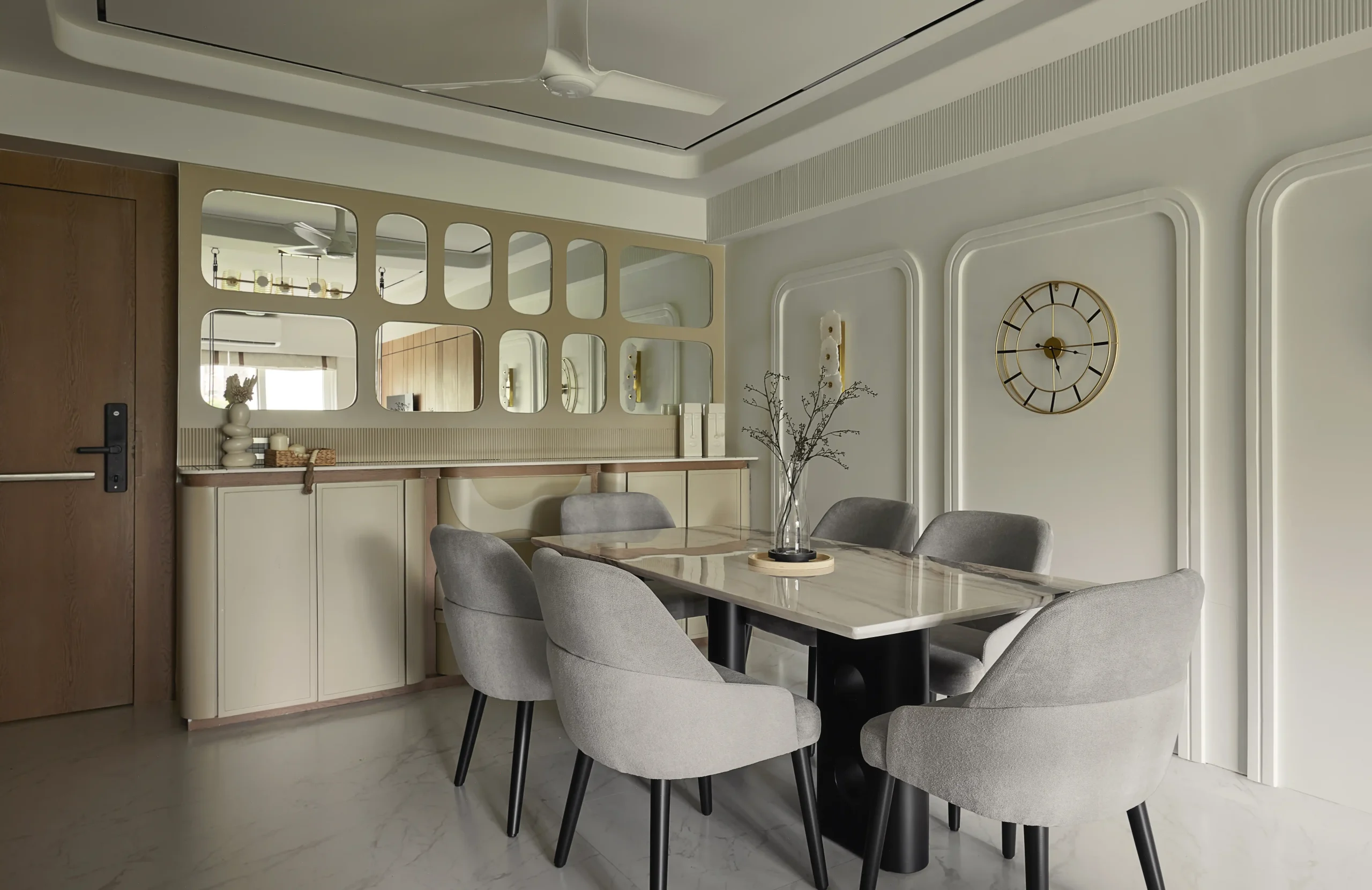 The living and dining areas featured and mirrored installations that reflect light and amplify warmth. Marble flooring, arched niches, and layered lighting add depth and sophistication throughout.